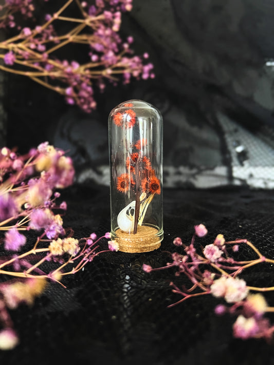 Small Minivet (Pericrocotus Cinnamomeus) Bird Skull & Red Stirlingia Flower in Glass Vial