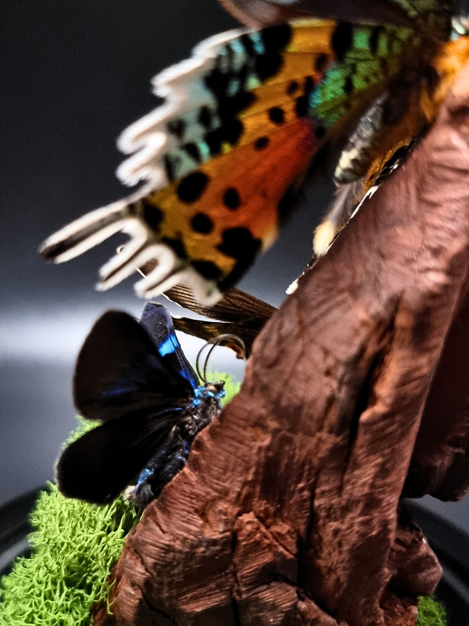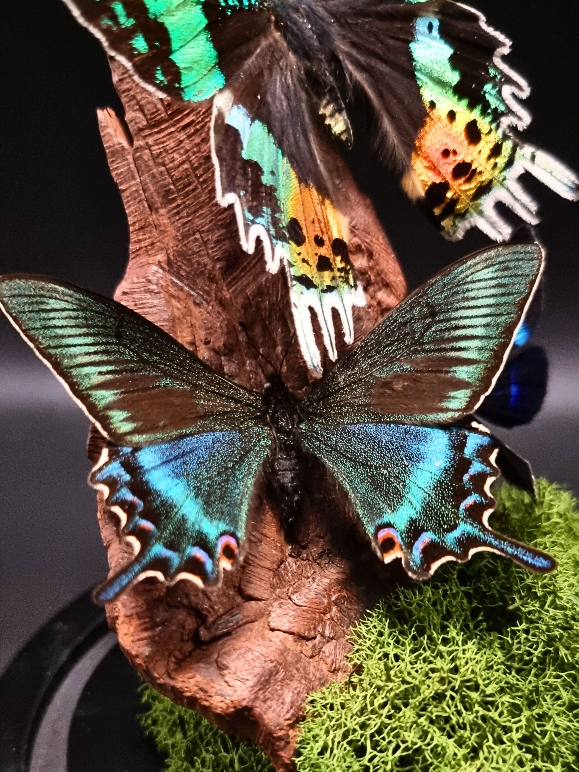 This dome features an array of stunning colours from two day moths; one being a Madagascan Sunset Moth, the other a Blue Day Flying Moth and between them lies an Alpine Black Swallowtail (spring form) adding more depth to the palette as well as a unique, satin black patch on their wings made up of extremely fine hairs.