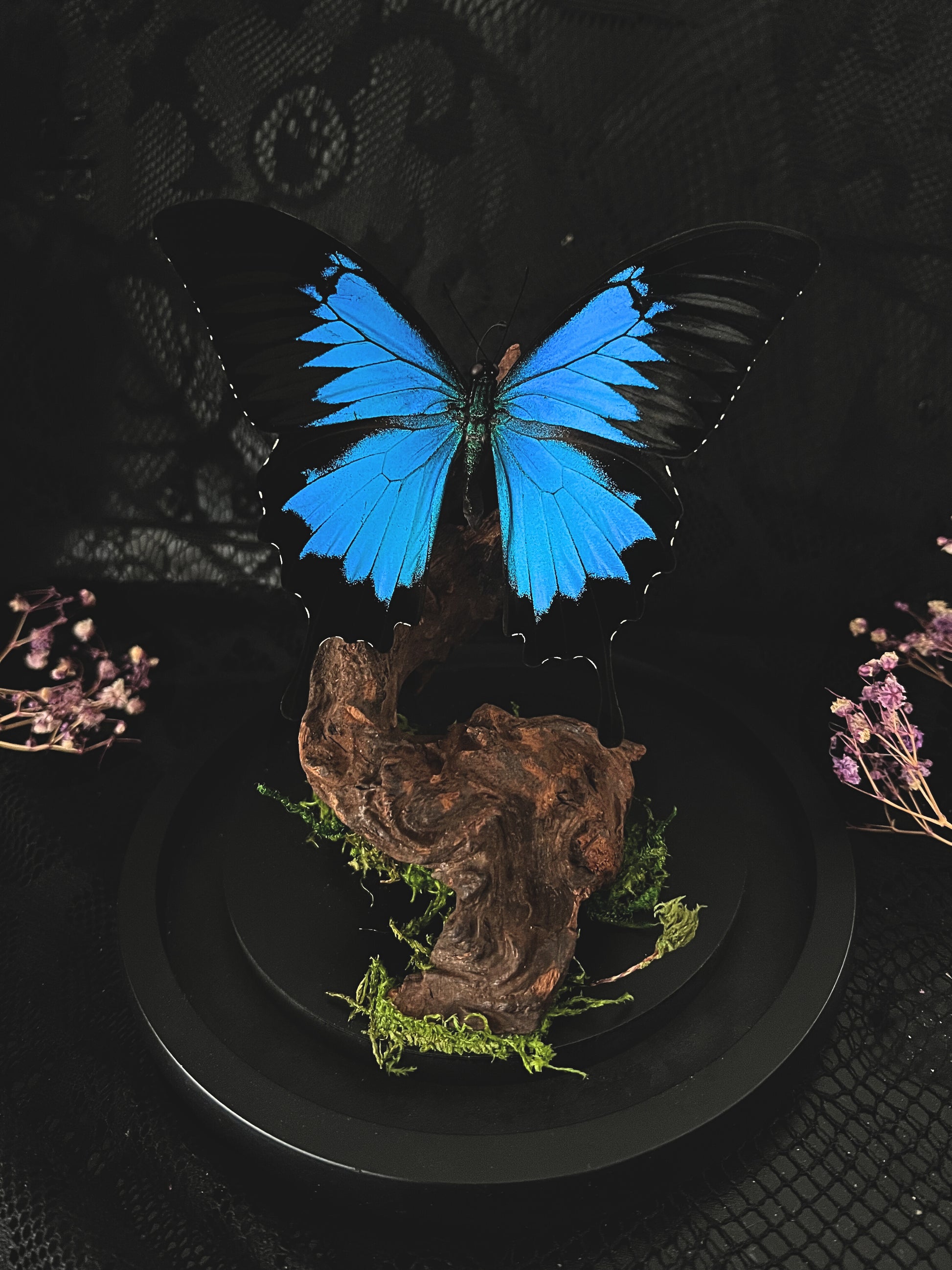 Real preserved Blue Mountain Swallowtail Butterfly on a driftwood piece and small bed of moss, housed under a glass dome with a black base.
