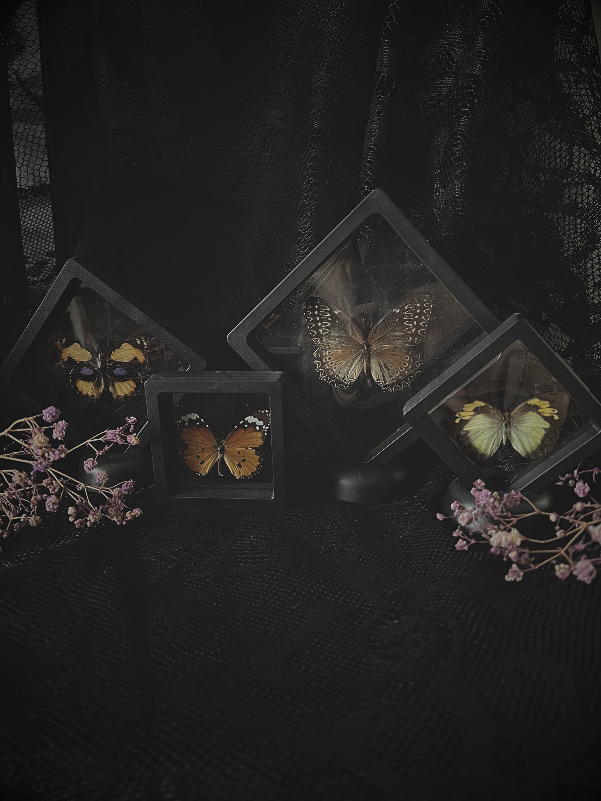 Real preserved butterflies which have been spread inside a display case. They are a beautiful addition to your curiosity collection.