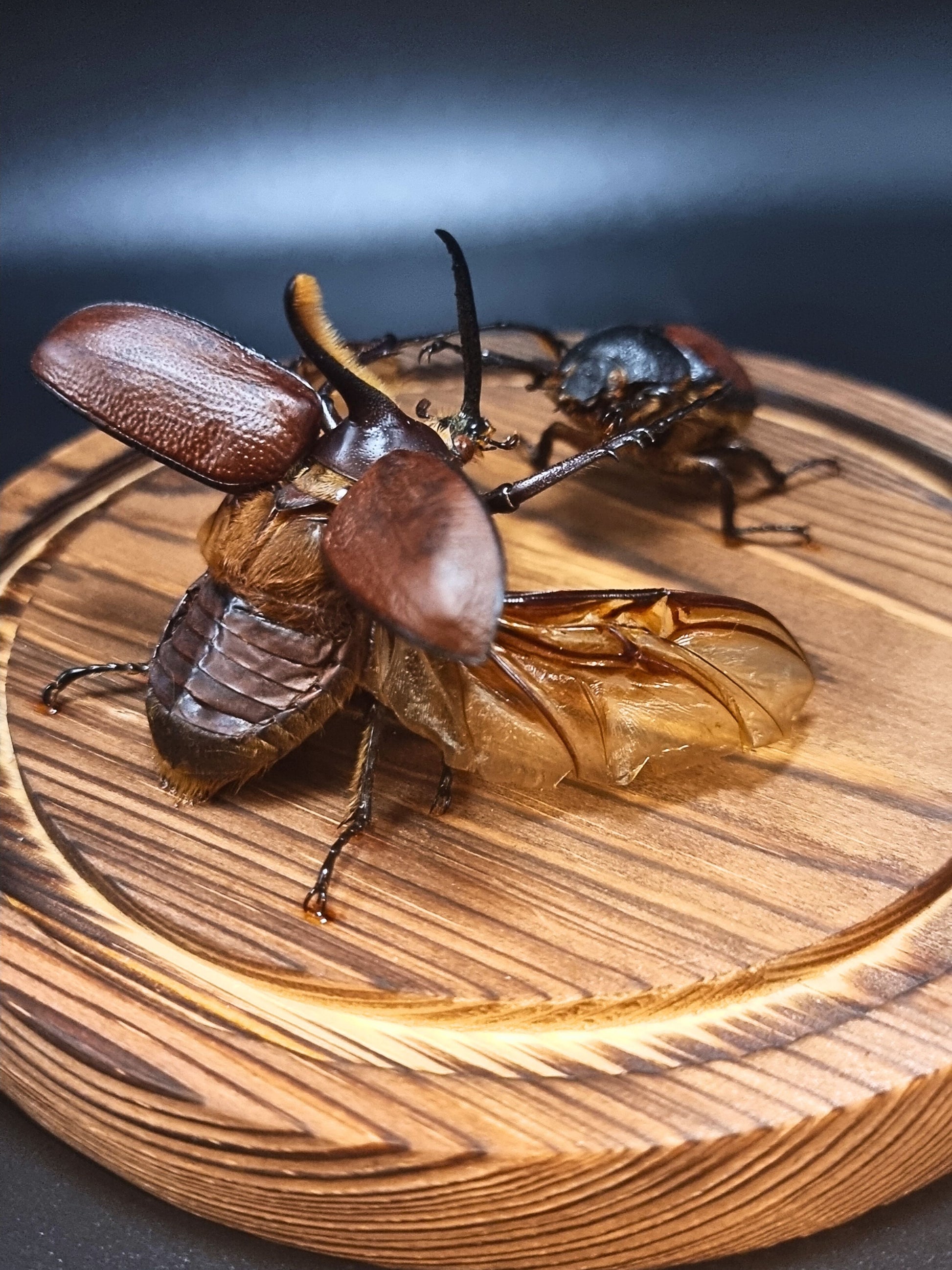 Real preserved male and female pair of Golofa Aecus beetles of the Dynastidae family, more commonly known as rhino beetles. These Peruvian beetles spend most of their lives in trees, from a larvae stage housed in decaying wood to an adult spending the nights feeding on sap and fruits. This pair has been pinned and positioned to be reaching out towards each other while the males wings have also been extended. Both beetles have been degreased and are mounted by their abdomen and legs.