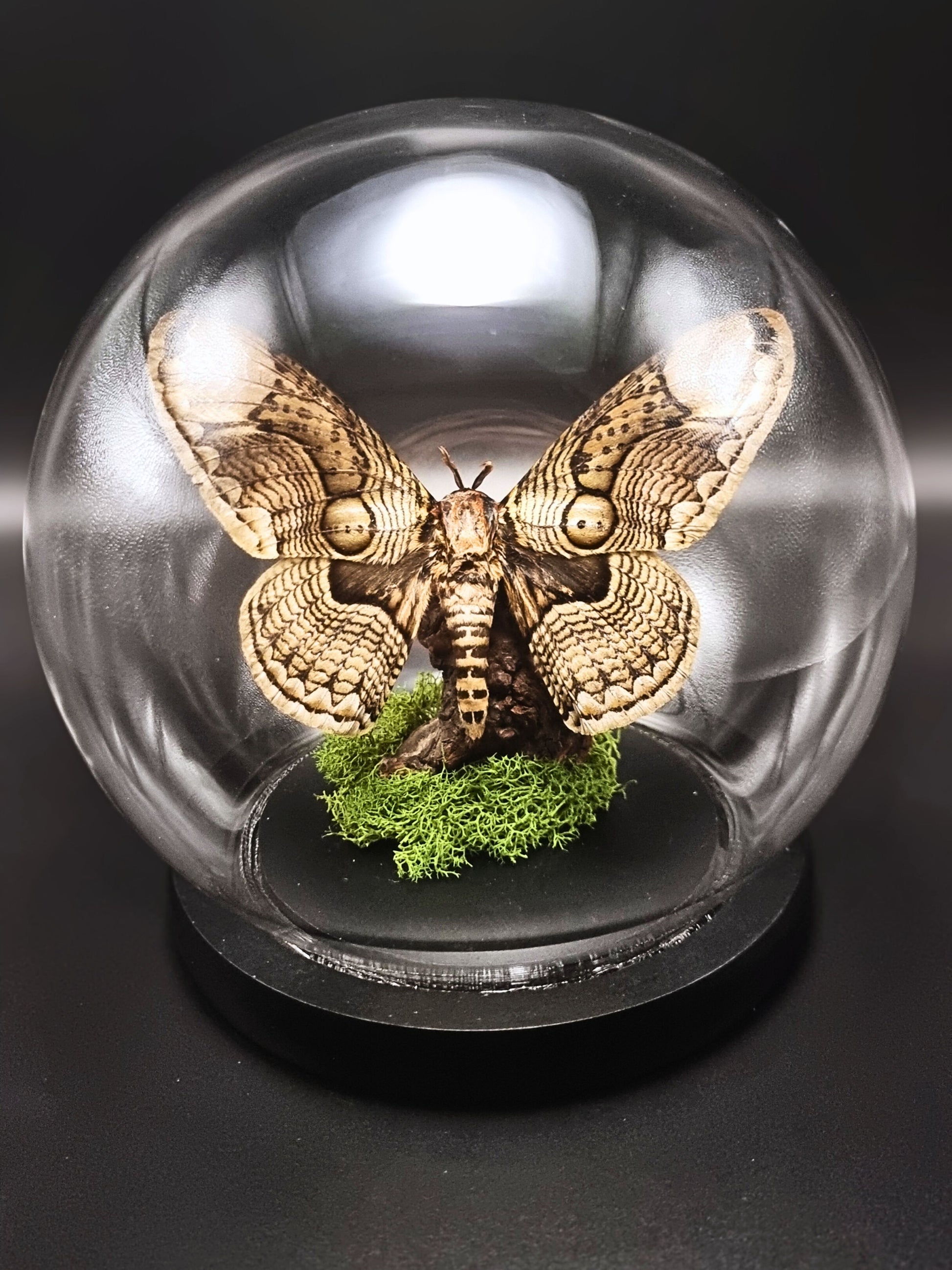 Real preserved Brahmaea Hearseyi, sat atop a small piece of driftwood and housed in a glass globe. These Owl Moths are found across Eastern and South East Asia and have been the basis of a number of folklore stories often seeing these moths painted as omens or spirits. While most of these stories speak of them as a sign or coming of death, some Chinese traditions believe the moths to be ancestral messengers or guides hiding secrets and wisdom within the markings on their wings.