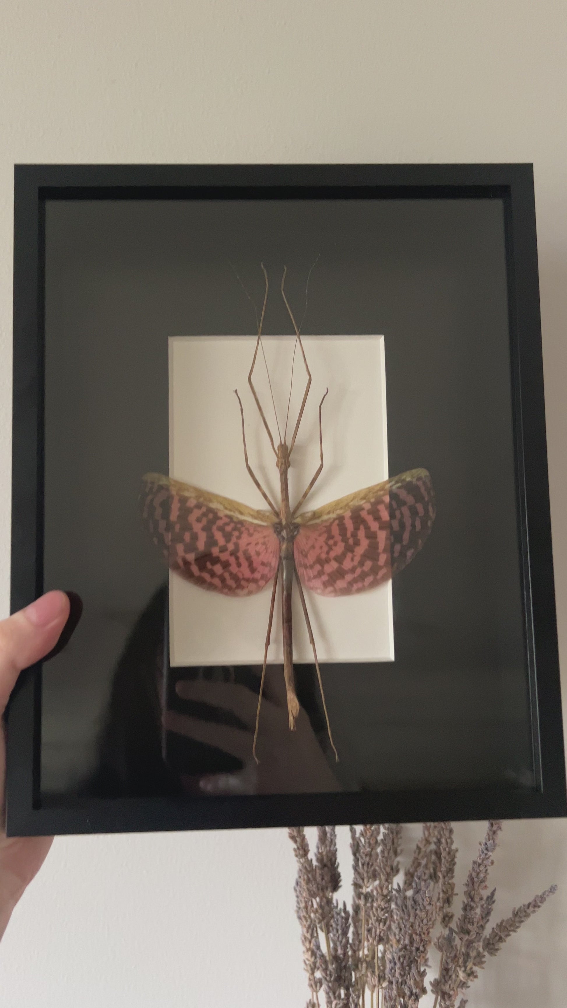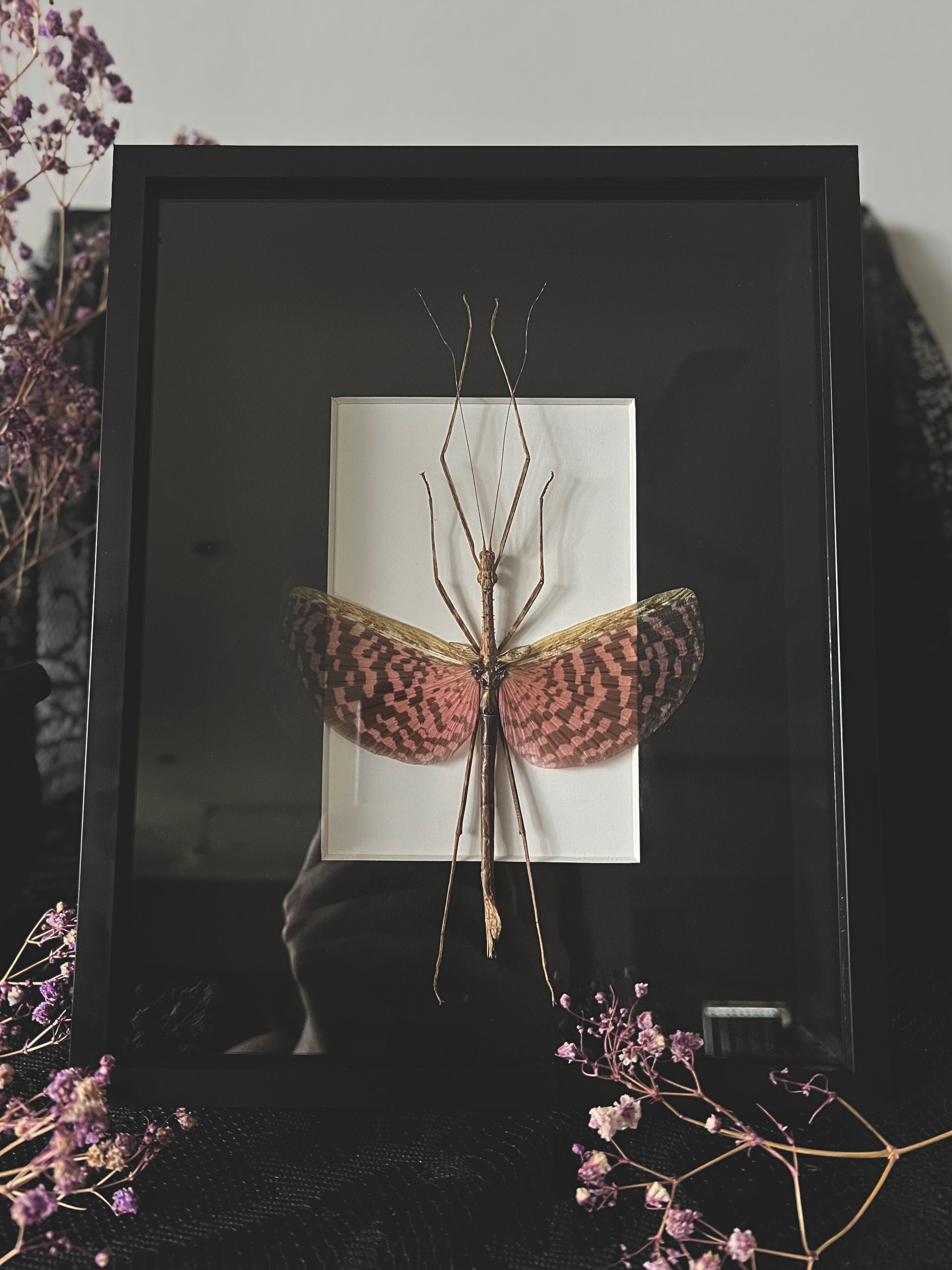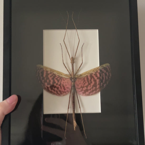 Real preserved female Tessellated Spiny Flying Stick insect inside a shadow box frame.