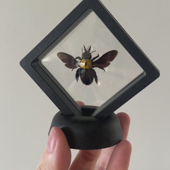 Real preserved female yellow carpenter bee in a display case.