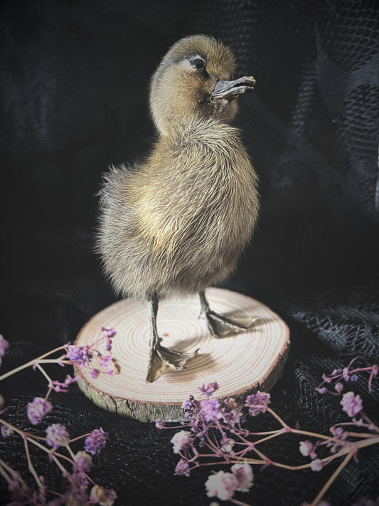 Taxidermy Brown Duckling on Wood Slice